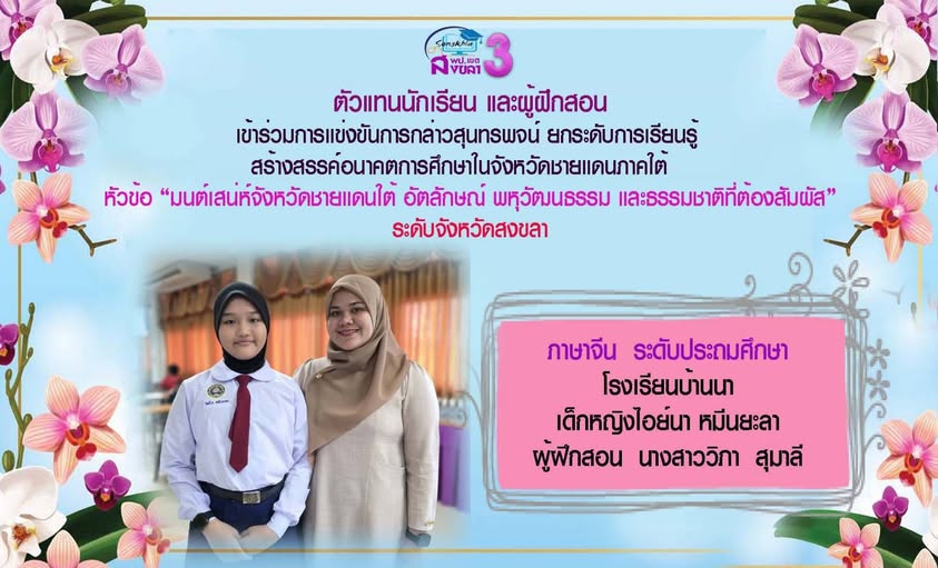 รางวัลชนะเลิศ การกล่าวสุนทรพจน์ ภาษาจีน ของโรงเรียนบ้านนา อำเภอจะนะ จังหวัดสงขลา